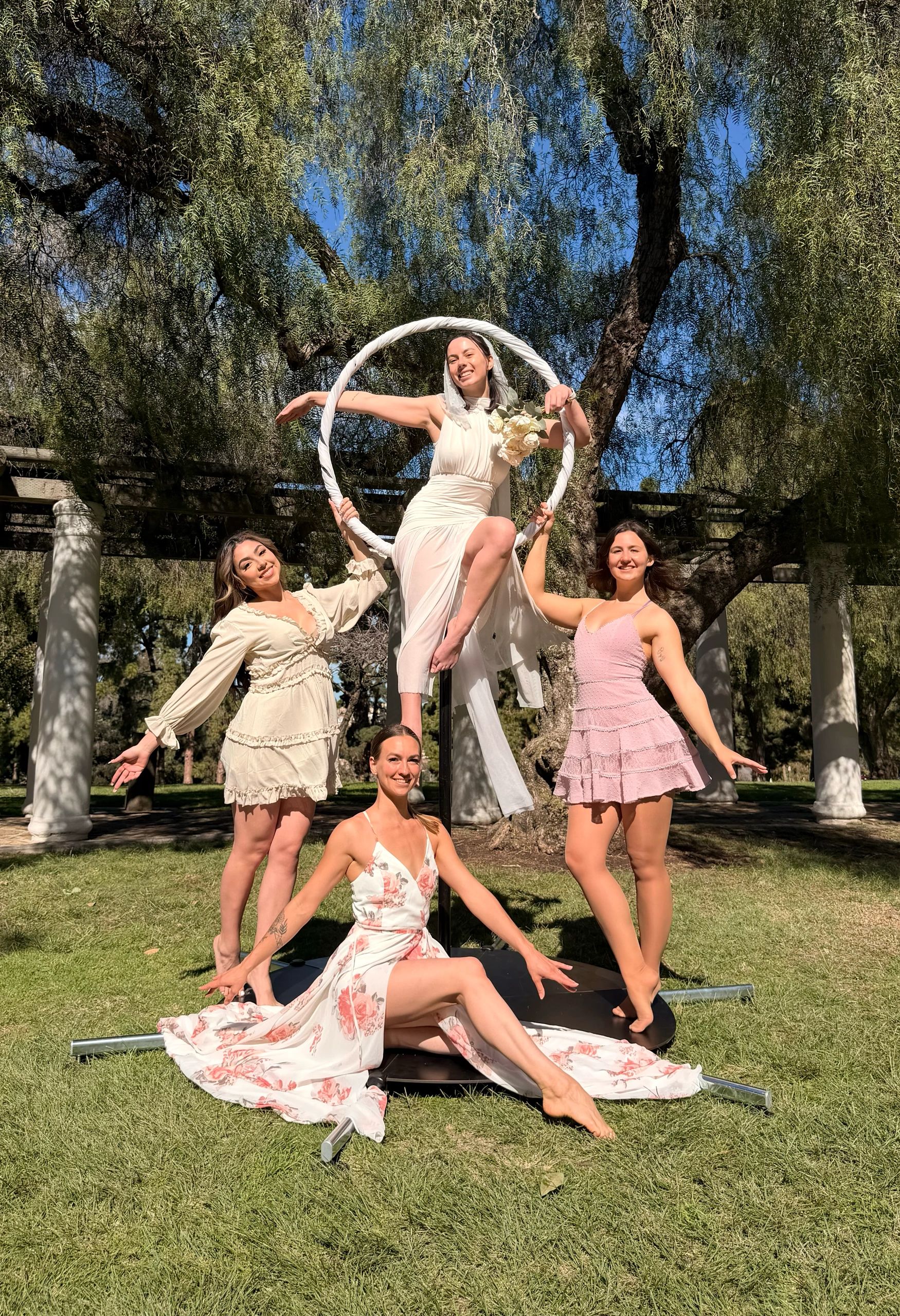 For first-timers or anyone wearing long dresses, we use a ladder to help you get onto the hoop safely — everyone can do it!